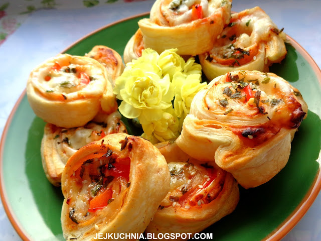Składniki:opakowanie ciasta francuskiego (u mnie 300 g),opakowanie mozzarelli,3 plastry szynki,3 plastry sera