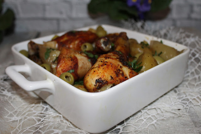Składniki:pałeczki z kurczaka 1 kg1/2 kg ziemniaków4 cebuleoliwki zielone bez pesteksól, pieprzpapryka słodka, papryka ostra mielonanatka