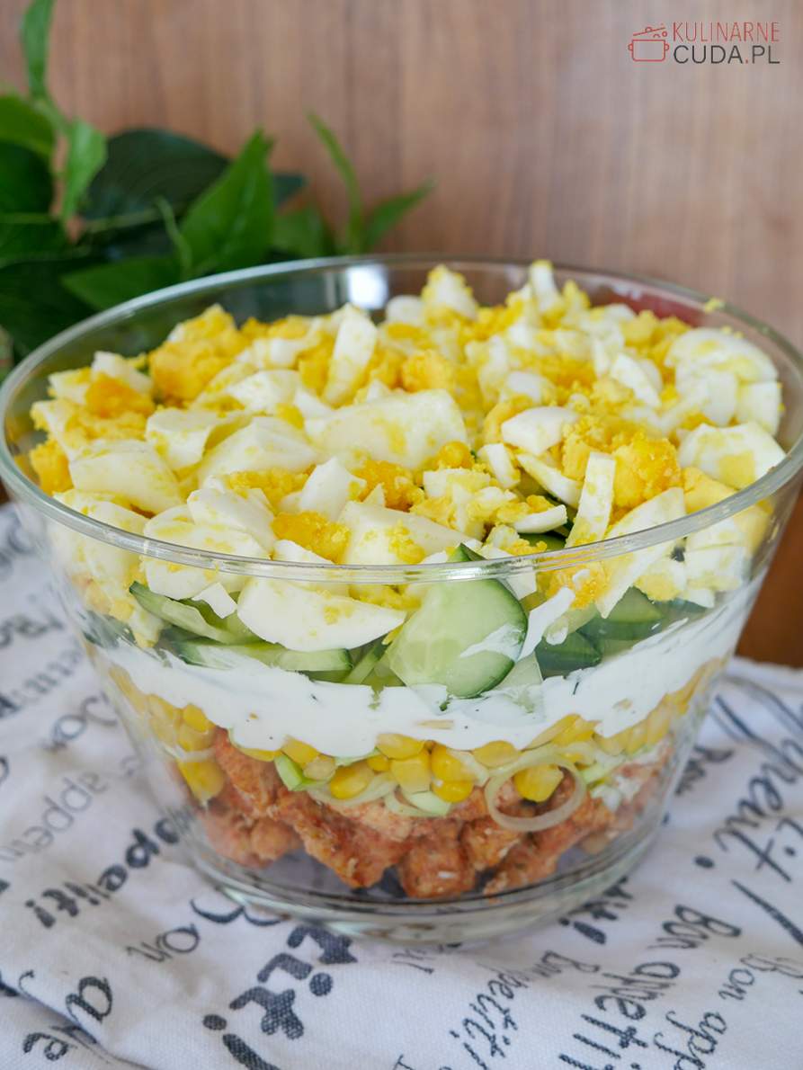 Pyszna, kolorowa sałatka warstwowa z kurczakiem, jajkiem, porem, kukurydzą i świeżym ogórkiem.…