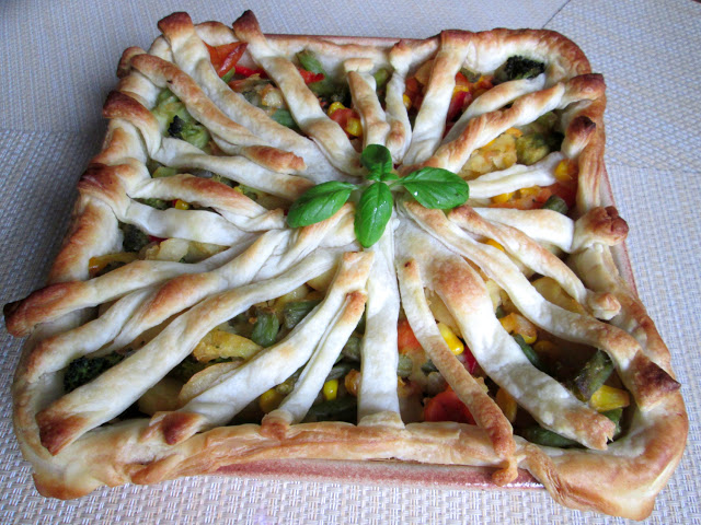 Super zdrowy i smaczny obiad.Składniki:Warzywa na patelnię 1 opakowanieCiasto francuskie 1 opakowanieSól do smakuOlej tłuszcz do formyWykonanie:Ciastem francuskim wyłożyć natłuszczona formę(część ciasta odłożyć do ozdobienia) i wyciągnąć brzegi. Warzywa wyłożyć na patelnię z dodatkiem odrobiny oleju i mieszając podgrzać z solą do smaku. Następnie przestudzić, wyłożyć na ciasto i