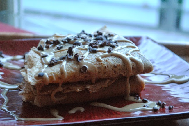 543. Ryżowe naleśniki z bananowym serkiem, dżemem jagodowym, tahini, ziarnem kakaowca