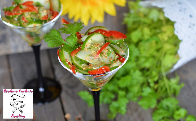Wyrazista w smaku sałatka na bazie świeżego ogórka, pachnącej kolendry, z mocnym akcentem ostrej papryczki i chrupiącą nutą prażonego sezamu doskonale pasuje do każdego rodzaju mięsa, idealnie sprawdzi się również podczas sezonu grillowego.