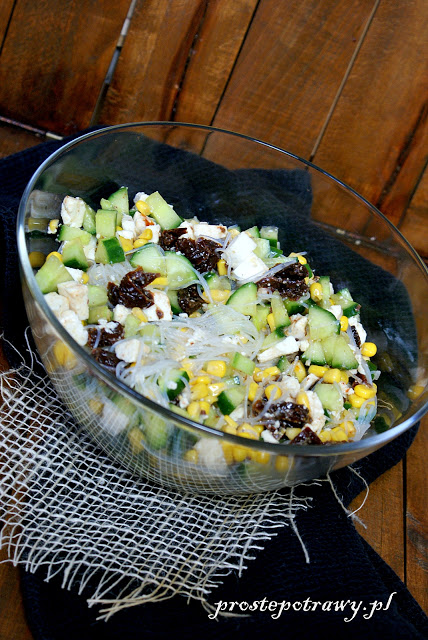 zielony ogóreksłoiczek suszonych pomidorów w olejumała puszka kukurydzybiały ser typu włoskiego- Capri (połowa opakowania)ok. 5 dag makaronu ryżowegoolej , sól