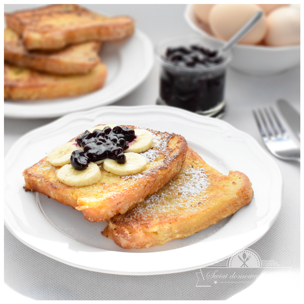 6 kromek chałki,2 jajka,100 ml mleka,2 łyżki cukru,masło,ulubione owoce: np. jagody, banan,…