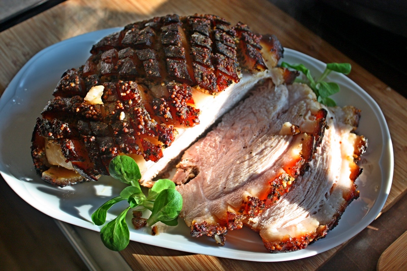 Szynka, midowo-musztardowa z czosnkiem niedźwiedzim Uwielbiam soczystą wieprzowinkę z chrupiąca skórką …ostro…