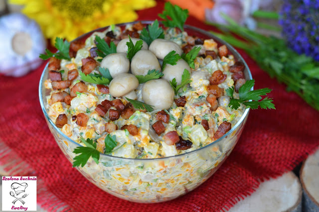 Smaczna, wartościowa sałatka na bazie bogatych w witaminy warzyw: pora, selera, marchewki, ziemniaków, która idealnie komponuje się ze smakiem marynowanych pieczarek i aromatycznego, chrupiącego wędzonego boczku.