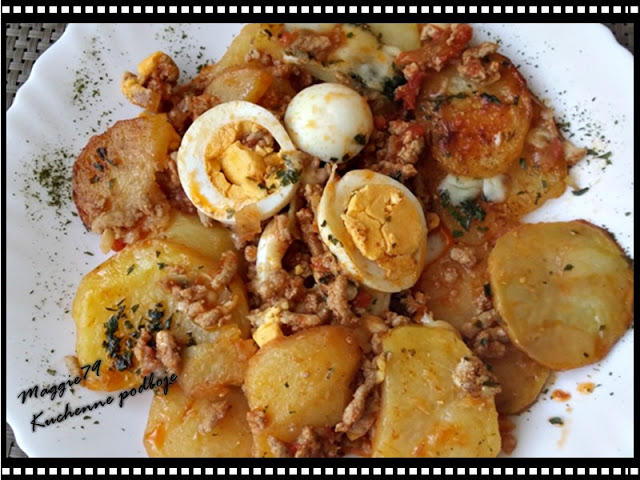 Sycące i smaczne danie z ziemniaków, i mielonego mięsa, wzbogacone jajkiem i żółtym seremSkładniki 1 kg ziemniaków½ kg mięsa mielonego wieprzowego1 puszka krojonych pomidorów bez skóry3 jajka150 g żółtego sera1 cebula2 ząbki czosnkuolej do smażeniasólpieprzsłodka papryka 1 łyżka siekanej natki pietruszkiSposób przygotowaniaJajka ugotować na twardo i pokroić w plasterki