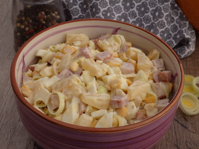 Dalsze czyszczenie szafki z puszek i powstała sałatka z porem. Towarzystwo kukurydzy…