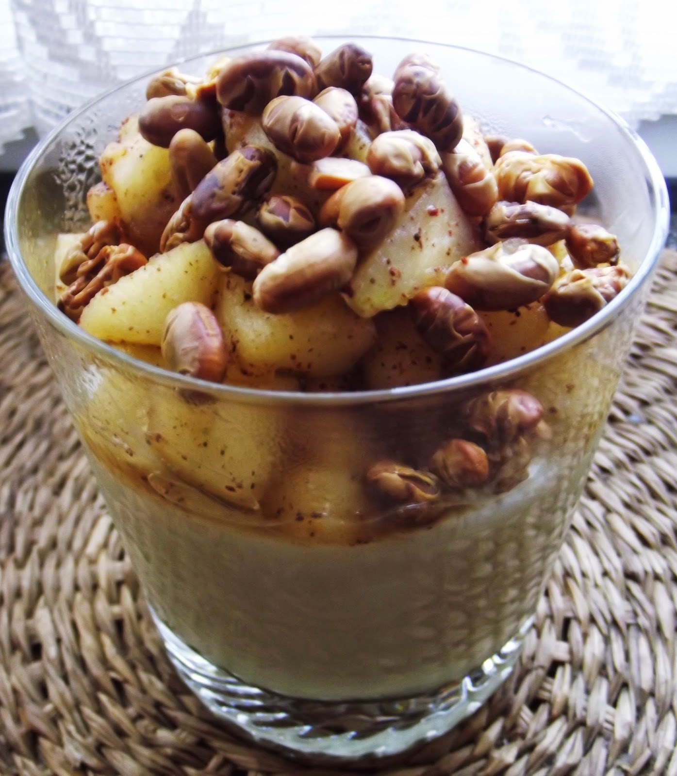 pudding waniliowy z prażonym jabłkiem z cynamonem i orzeszkami sojowymivanilla pudding with…