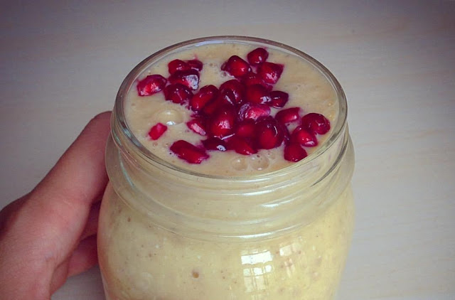 banan + pomarańcza + płatki owsiane + olej kokosowy + mleko z nerkowców + granat