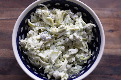 Zielona sałatka na bazie brokuła, jajek i pora z sosem majonezowo-jogurtowym.