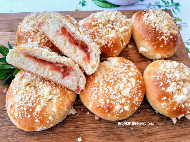 Pyszne bułeczki, bardzo mięciutkie z pysznym nadzieniem z rabarbaru i galaretek truskawkowych…