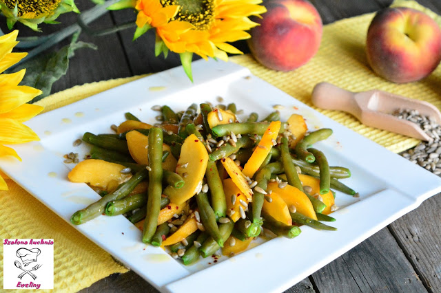 Nowatorskie podanie uwielbianej na naszych stołach fasolki w połączeniu ze świeżą brzoskwinią i słonecznikiem. Niezwykły smak tego dania podkreśla aromatyczny sos z nutą pikanterii. Takie połączenie wybornych smaków jest alternatywą dla tych, którzy nie lubią fasolki przygotowanej w tradycyjny sposób – z zasmażką z bułki tartej.