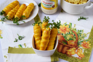 Jak tam Wasze przygotowania do świąt Wielkanocnych? Macie już zaplanowane przepisy świąteczne? Jeżeli nie, to mam dla Was pomysł na kreatywne podanie sałatki w kruchych rurkach. Aby rurki miały kształt marchewek to do ciasta można dodać pomarańczowy barwnik lub po prostu dosypać przyprawy barwiące jak: curry oraz paprykę czerwoną. Oczywiście