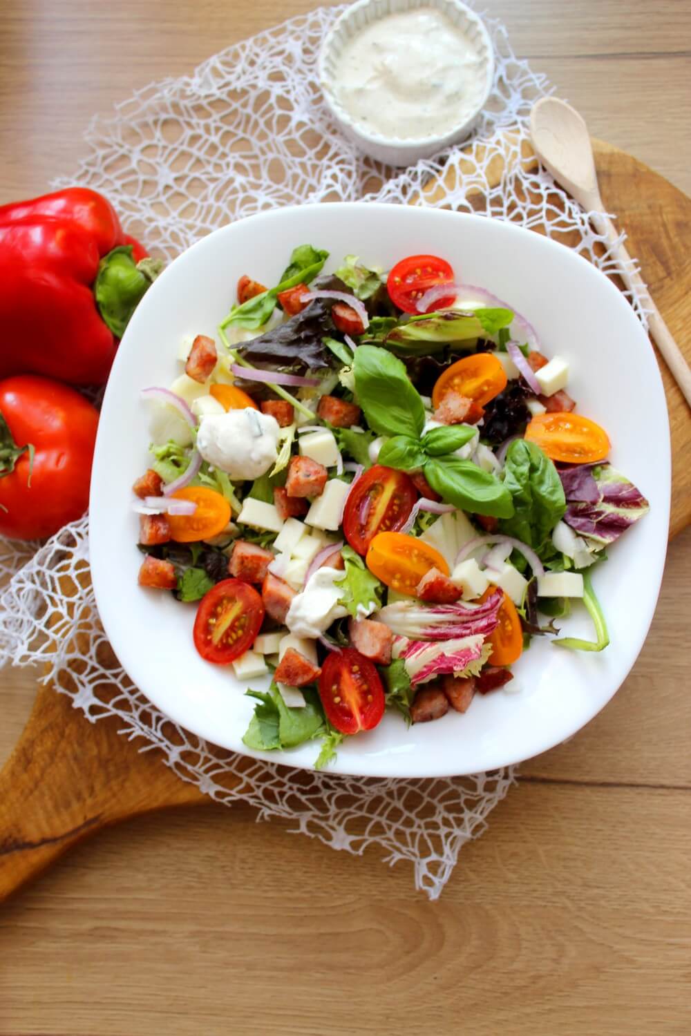 Sałatka z kiełbasą, halloumi i pomidorkami Lubicie sałatki ? Ja uwielbiam Dziś…