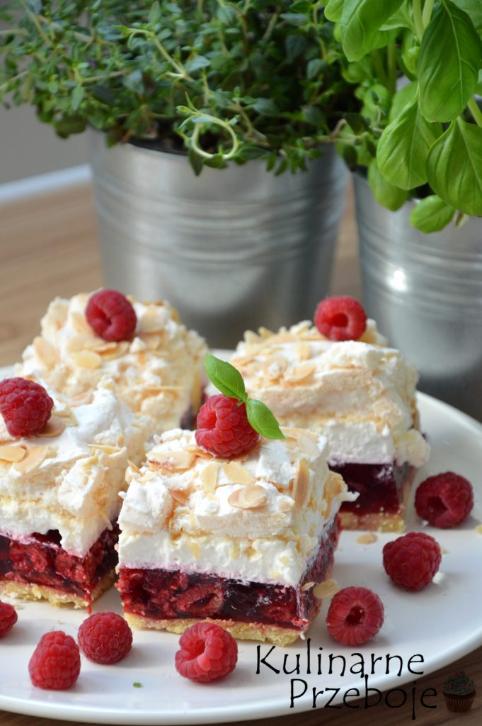 Malinowa chmurka – to ciasto, którego nie da się nie kochać 😉 Kruchy spód (możecie zastąpić go ewentualnie herbatnikami lub pokruszonymi ciasteczkami owsianymi wymieszanymi z masłem, jak np. w tym przepisie: Sernik na zimno z malinami (z serka mascarpone)) połączony z malinami, galaretką, kremem i bezą to