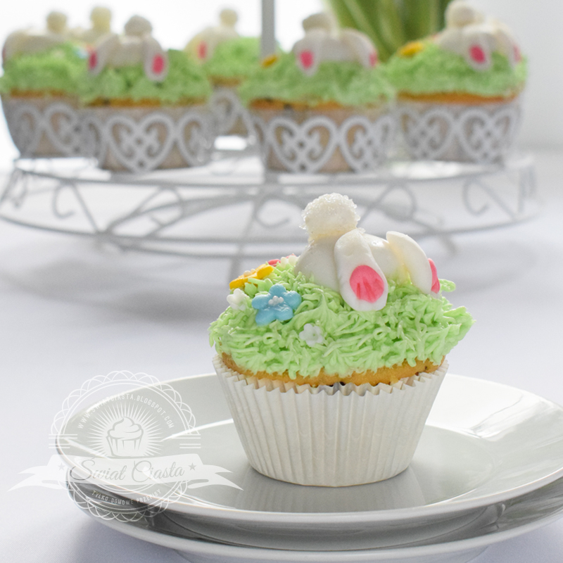 U mnie przed Wielkanocą – inwazja wygłodniałych króliczków 🙂 Wszystkie szukają marchewek… a raczej czekoladek, które są ukryte wewnątrz muffinek. Proponuję fajny przepis na mięciutkie babeczki z lekkim aromatem waniliowym, z dodatkiem płatków czekoladowych i oryginalną dekoracją wielkanocną z masy cukrowej. Na pewno przypadną do gustu nie tylko