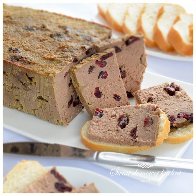 1 l bulionu,500 g mięsa wieprzowego,500 g mięsa wołowego,500 g wątróbek drobiowych,1 udko z kurczaka,1 cebula,1 szklanka suszonej żurawiny,3 jajka,3 liście laurowe,6 ziaren ziela angielskiego,1/2 łyżeczki gałki muszkatołowej,szczypta imbiru,sól i pieprz do smaku.