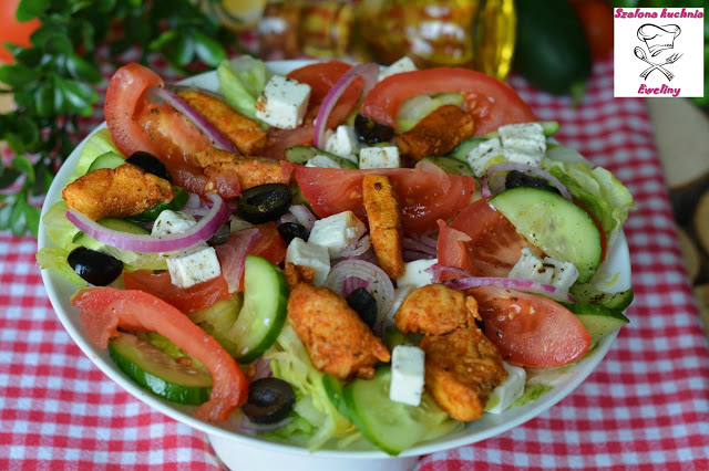 Soczysty, złocisty kurczak z tradycyjną grecką sałatką ze świeżych, grubo krojonych warzyw, wyrazistych w smaku czarnych oliwek i sera fety, który jest uważany za najlepszy kulinarny wynalazek greckiej kuchni to świetny pomysł na letnie, lekkie danie obiadowe oraz na pożywne drugie śniadanie.