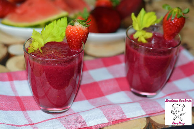 100g ugotowanego buraczka120g truskawek320g arbuza1 banan1/2 szklanki lekko gazowanej wody1 łyżka miodu2 łyżki soku z cytryny