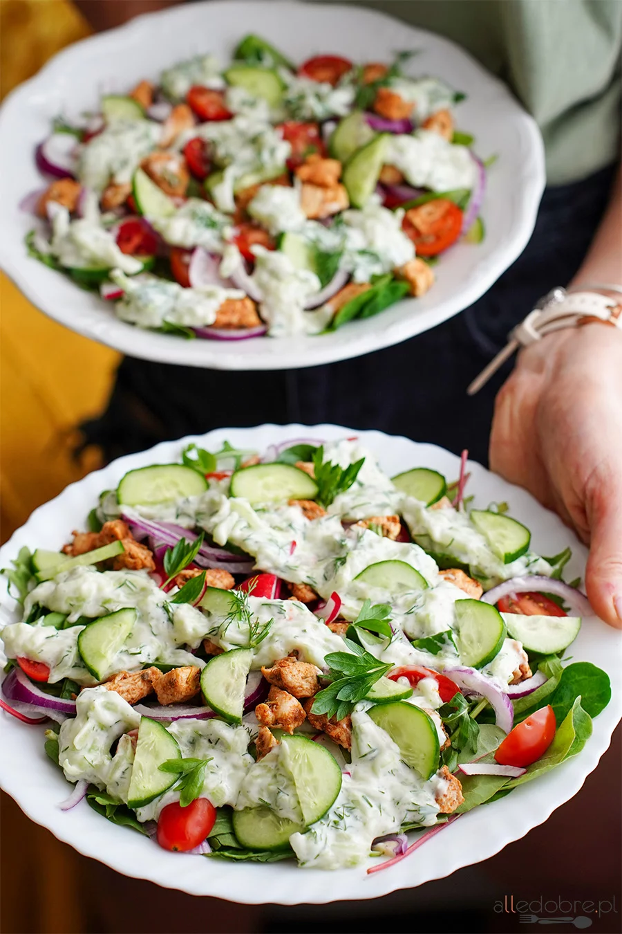 Dużą rolę odgrywa tutaj sos. To on nadaje sałatce charakter i spaja wszystkie elementy w jedną spójną kompozycję. Dzięki niemu całość jest aromatyczna, delikatnie kremowa i przyjemnie doprawiona.