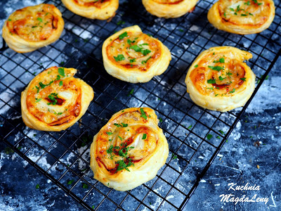 Ślimaczki z ciasta francuskiego z salami, serem żółtym i cebulą. Szybkie przekąski…