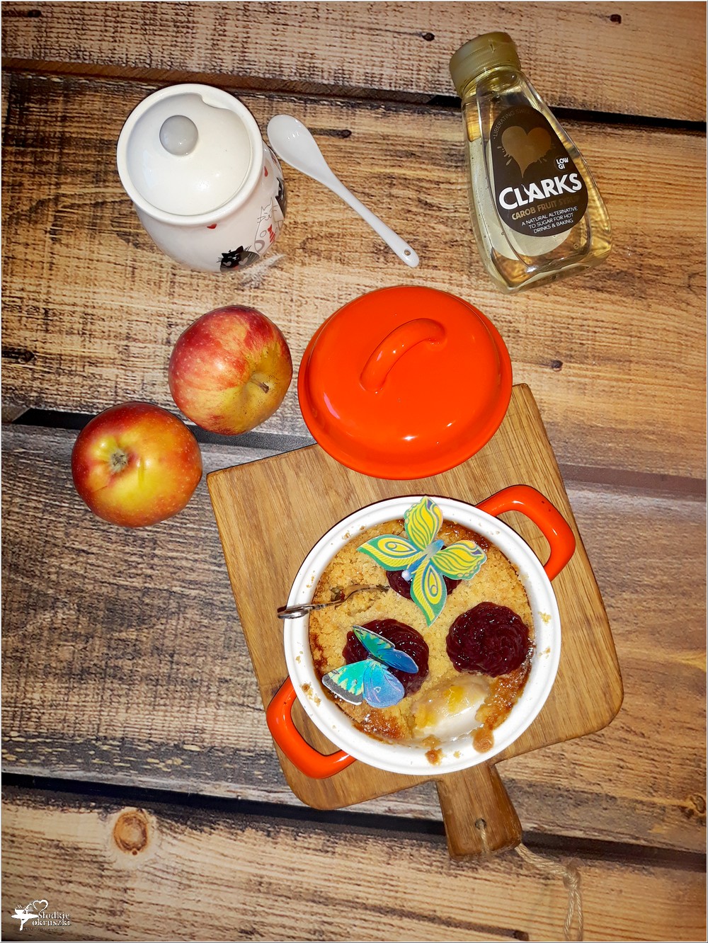 Pieczony deser – banany, jabłka i syrop z karobu pod kruszonką. Prosto, szybko i smacznie. Taki deser wspaniale smakuje z gałką lodów lub świeżymi malinami. U mnie dziś wersja z nadzieniem malinowym. Lekko kwaskowate nadzienie doskonale komponuje się ze słodkim deserem. Taki deser możecie również przygotować np. z