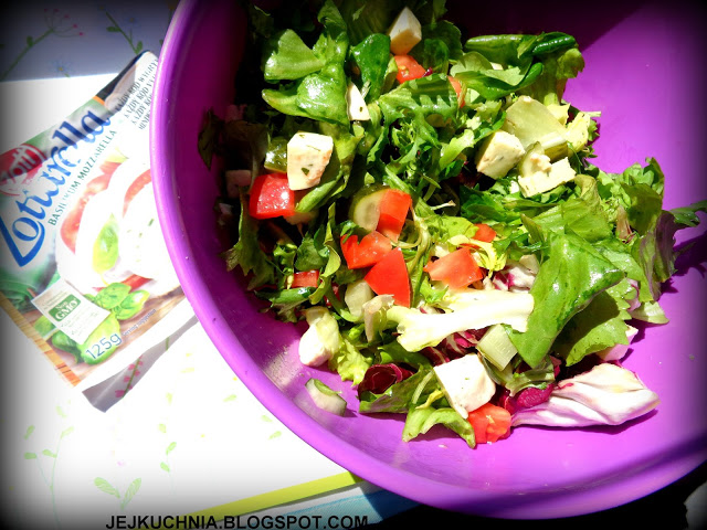 Składniki:opakowanie mieszanki sałat (u mnie z roszponką) – 140 g,większy pomidor,2 większe