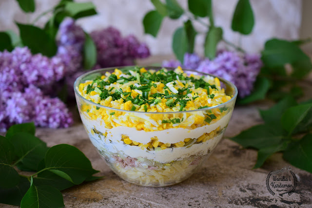 15-20 dag twardego sera żółtego1 puszka tuńczyka w sosie własnym6 jaj4 ogórki kiszone2 małe cebule1 mała puszka kukurydzy4 łyżki majonezuSól himalajska do smakuŚwieżo mielony pieprz o smakuPęczek szczypiorku do posypania