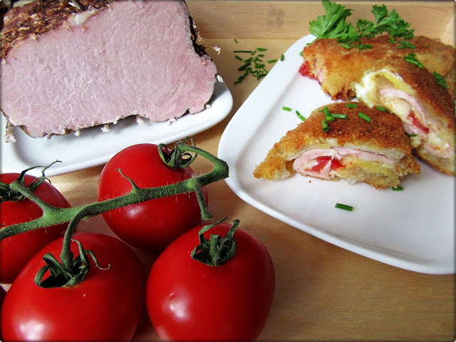 3. Na każdej ułożyć polędwicę, ser, pomidora i