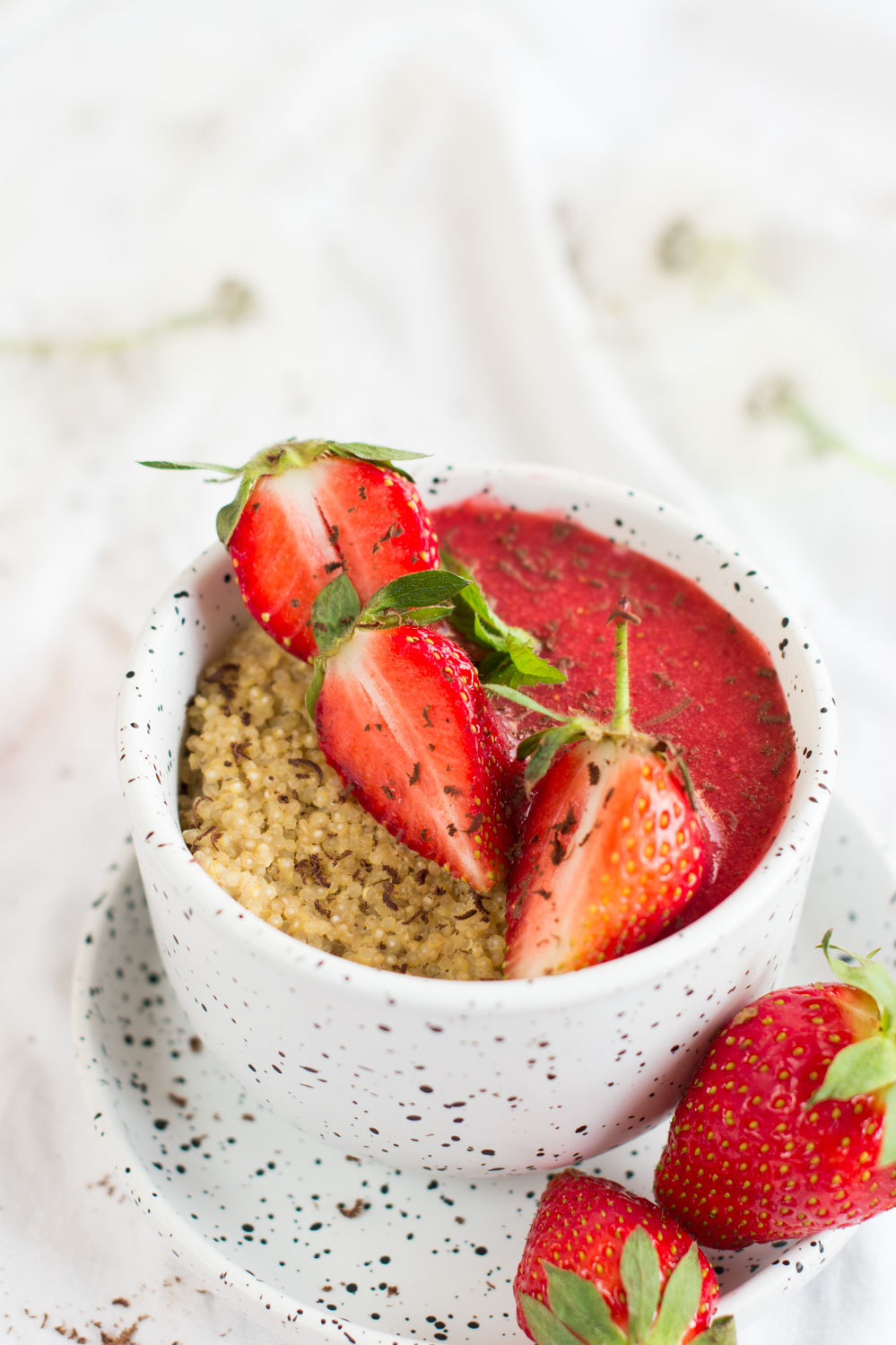 Słodkie, zdrowe śniadanie z pysznymi, sezonowymi truskawkami. Szalenie proste i szybkie w przygotowaniu. Komosa ryżowa ma wiele, cennych właściwości. Dzięki dużej zawartości pełnowartościowego białka jest świetną alternatywą dla wegetarian i wegan. Moje śniadanie dosłodziłam syropem z agawy, ale oczywiście dodajemy dowolny produkt słodzący. Dodatek tahini powoduje, że całość ma lekki