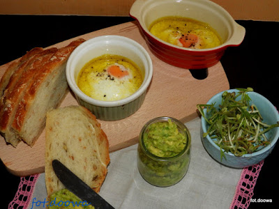 Do jaj idealnie pasuje tutaj pasta z awokado z czerwonym pieprzem i ulubione pieczywo na zakwasie.