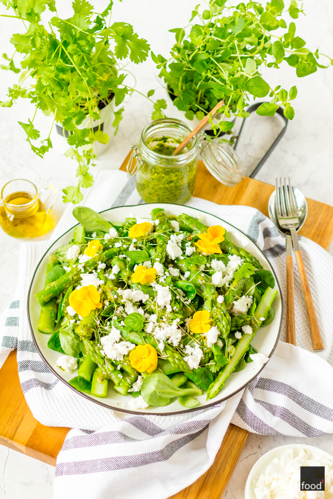 Póki sezon na szparagi jeszcze trwa, należy się Wam jeszcze jedna szparagowa propozycja — cudownie zielona i pyszna sałatka z serem feta, roszponką, świeżymi ziołami i sosem .