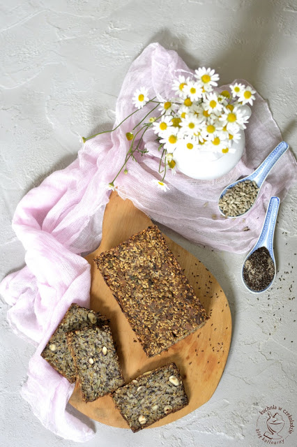 Ostatnio, na wzór właśnie tamtego przygotowałam kolejny, choć tym razem spoiwem było nie tylko siemię lniane ale też nasiona babki płesznik. Ponadto słonecznik, dynia, trochę orzechów i migdałów.