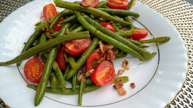 35-40 dag zielonej fasolki szparagowej 2 plastry wędzonego boczku1 cebulka20 dag pomidorków cherry bądź koktajlowych 2 – 3 łyżki oleju pieprz1 łyżeczka czubrycy zielonej Umytą i oczyszczoną fasolkę szparagową gotować ok 8-10 min,