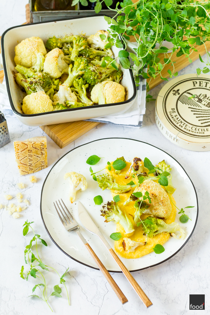 Piekliście kiedyś kalafiora? Nie? To musicie wypróbować ten przepis! Różyczki białego kalafiora i jego włoskiego kuzyna — romanesco skropiłem oliwą z oliwek, natarłem solą oraz czosnkiem i posypałem porcją parmezanu, który cudownie się na nim roztopił. Zrumienionego w piekarniku kalafiora podałem na kremowej maślanej polencie i udekorowałem świeżymi listkami oregano.