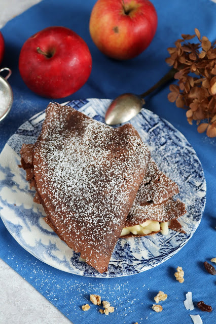 Pyszne naleśniki czekoladowe z smażonymi owocami.Składniki:40 gram gorzkiej czekolady1/2 łyżki kakao250 ml…