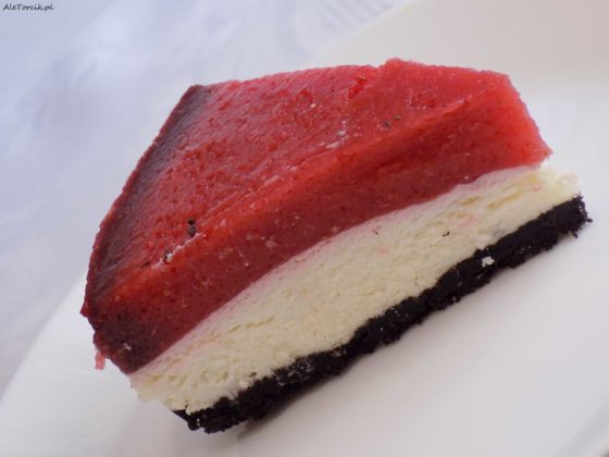 Ciasto stworzone dla wielbicieli ciasteczek Oreo. Kruchy, lekko gorzkawy spód, krem na bazie kremówki, serka mascarpone i białej czekolady. Całość wykończona orzeźwiającym musem truskawkowym.