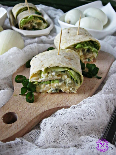 Pyszna śniadaniowa pasta jajeczna z kiszonym ogórkiem i tartą rzodkiewką. Całość owinięta wieloziarnistą tortillą. Idealne na śniadanie, przystawkę lub do pudełka do pracy.