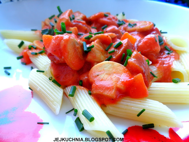 Składniki:300 g makaronu,1/2 laski kiełbasy,30 dag małych pieczarek,większa marchewka (ugotowana),duży pomidor,200