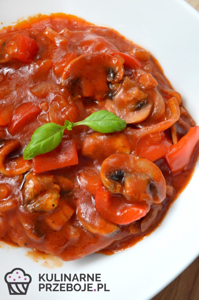 Karkówka pieczona w ketchupie – prosta, pyszna, krucha karkówka zapiekana w ketchupie z pieczarkami i papryką. Polecam na obiad lub kolację. Najlepiej smakuje dnia kolejnego po podgrzaniu. Z kilograma karkówki wydzieliłam 7 plastrów o grubości ok. 1-1,5 cm.