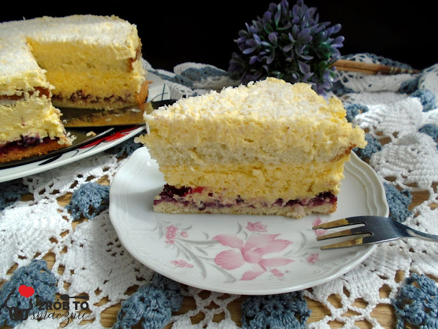 Pyszne ciasto na każdą okazję. Biszkopt+ krem budyniowy z kokosem a całość przełamuje kwaśny posmak konfitury porzeczkowej. Zarówno mężowi jak i gościom bardzo smakowało.