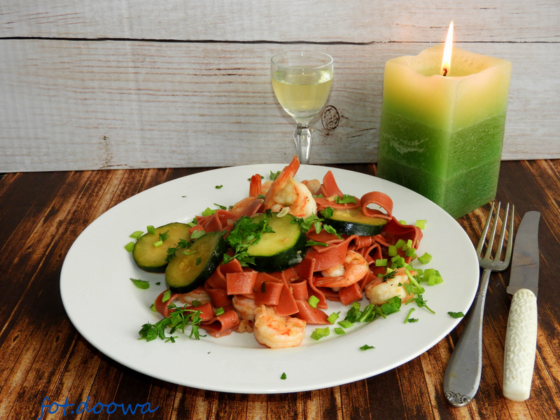 Makaron buraczkowy z krewetkami, ziołami i cukinią.