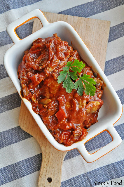 Smaczne mięsko w gęstym sosie pomidorowym z papryką i pieczarkami. Można je podać z ziemniakami lub kaszą. Nada się na codzienny obiad jak i taki niedzielny, rodzinny, bo porcja z przepisu wychodzi całkiem słuszna 🙂