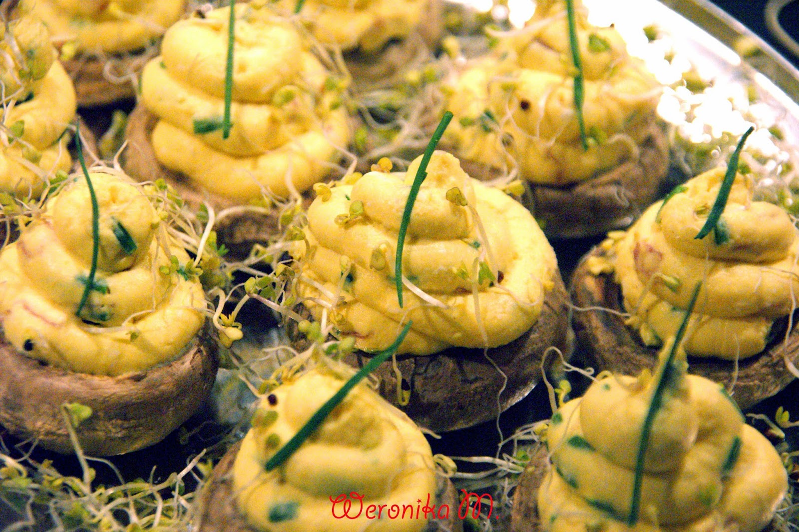 zapiekane pieczarki z pastą jajeczną z boczkiem i szczypiorkiem