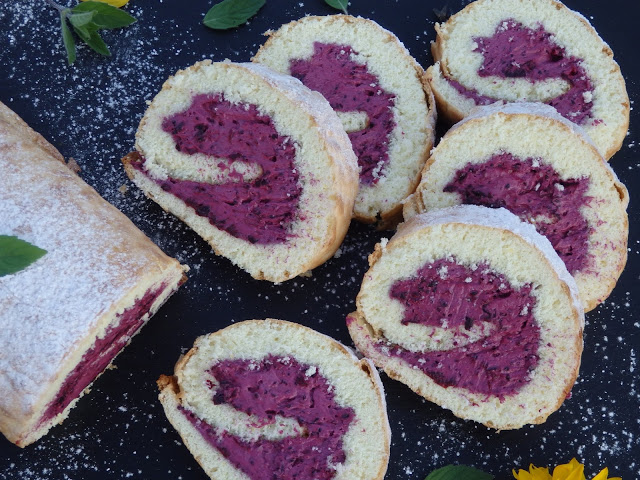 Była ochota na coś słodkiego więc powstała rolada. Pod ręką miałam czarne porzeczki więc wykorzystałam je do kremu. Dzięki nim krem nabrała ładnego intensywnego koloru. Roladkę robiłam na szybko i posypałam tylko cukrem pudrem ale można ją też ładnie udekorować.