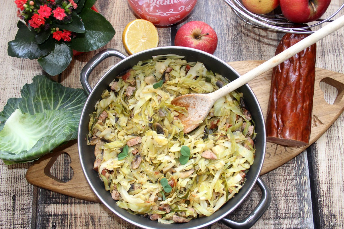 Młoda kapusta z krakowską i pieczarkami
