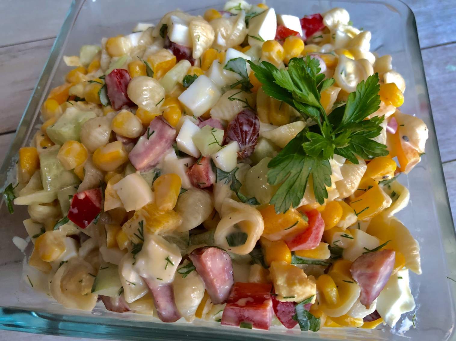 Szybka, prosta i pyszna sałatka z makaronem, warzywami, kabanosem i kremowym sosem jogurtowo-majonezowy dopełnionym lekko czosnkową nutką. Idealnie sprawdzi się zarówno na kolację jak i jako drugie śniadanie w pracy albo pyszna sałatka na przyjęcie!