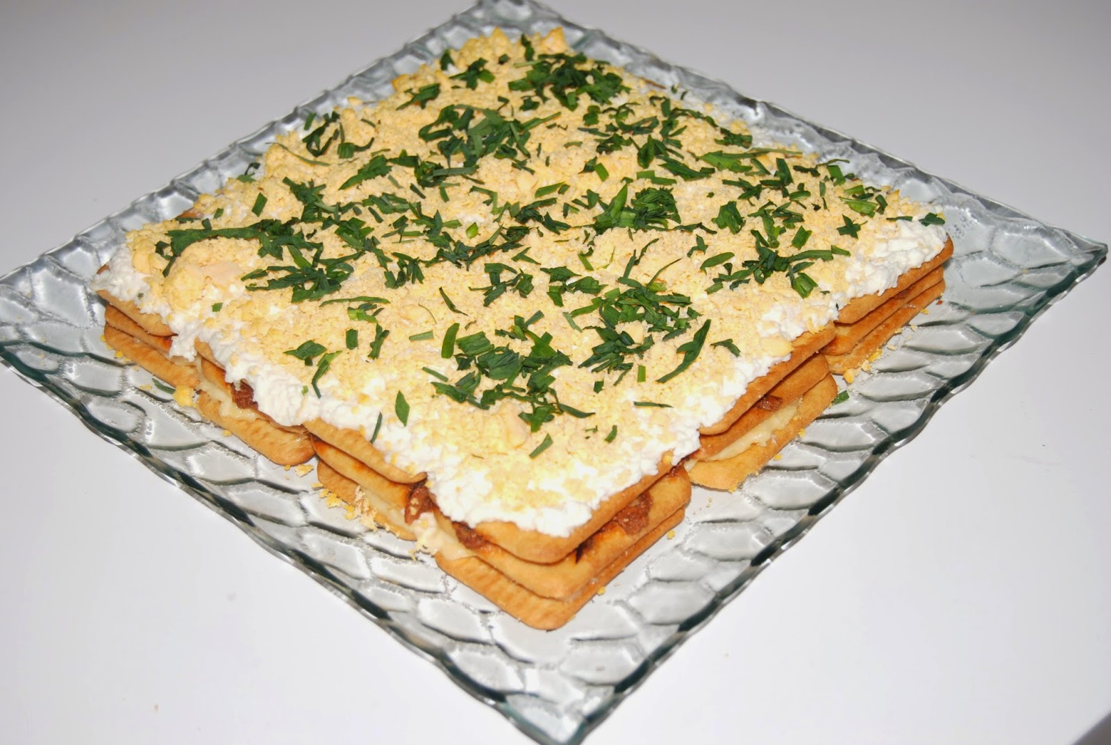Sałatka wyglądem przypomina ciasto. Poszczególne warstwy ułożone są na krakersach.Kiedy zobaczyłam ją…