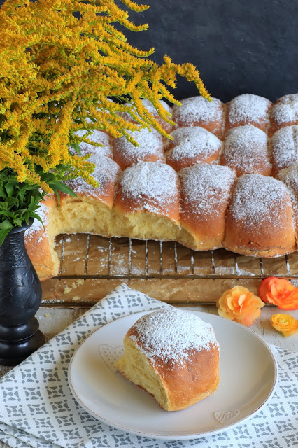 Uwielbiam domowe pieczywo. Lubię też eksperymentować z różnymi smakami i tak też powstały bułki dyniowe. Są pyszne i delikatne, zaś dzięki samej dyni, zachowują świeżość na dłużej. Cynamonu dodałam jedynie symboliczną ilość, ale jeżeli chcecie, to możecie dodać więcej. Możecie również eksperymentować dodając odrobinę korzennych przypraw lub rodzynki. Mój